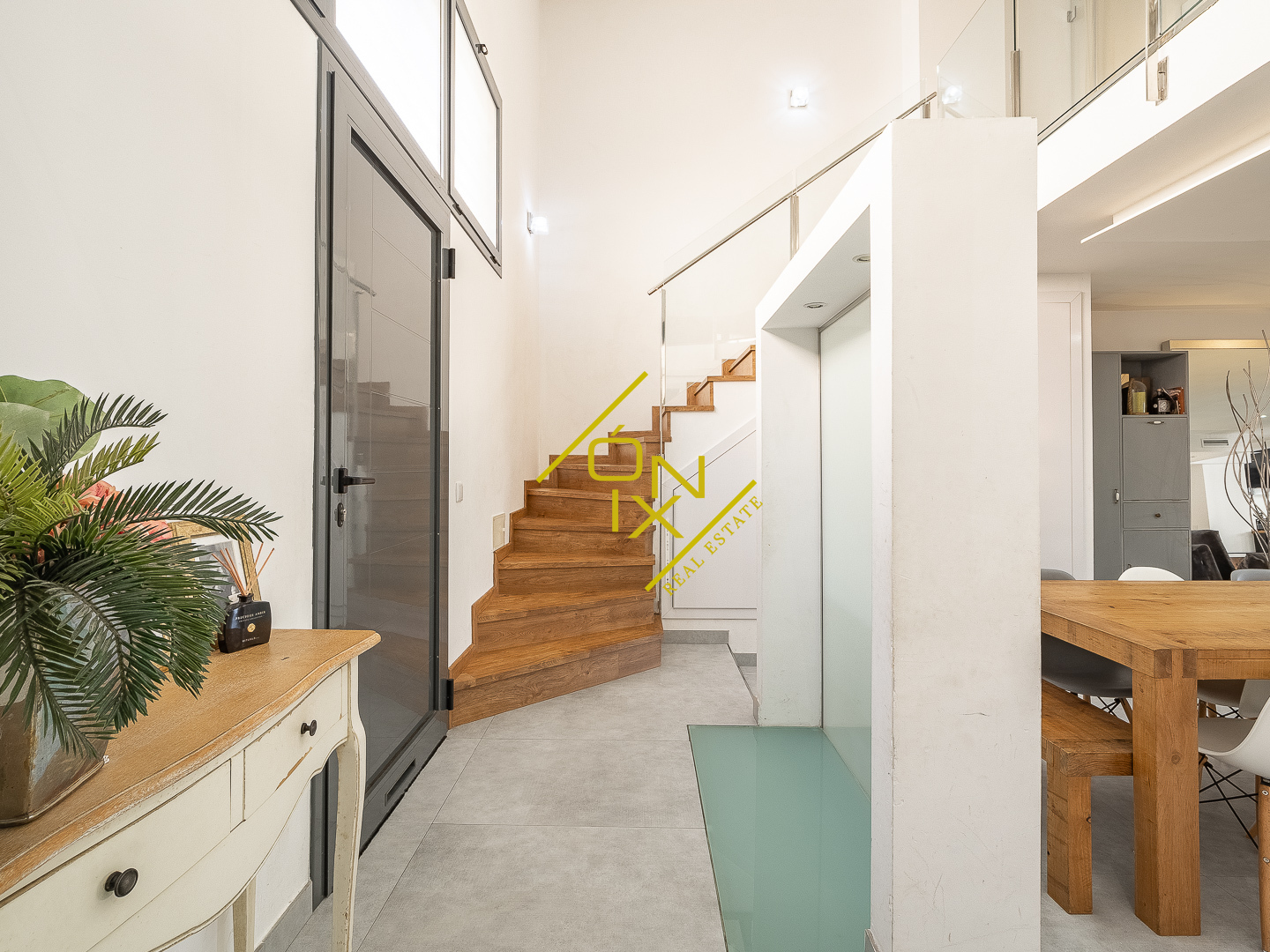 La planta principal ofrece un amplio y luminoso salón-comedor, que se integra de forma natural con una terraza cubierta gracias a unas espectaculares ventanas tipo acordeón, creando un espacio abierto, moderno y muy acogedor. La cocina de concepto abierto, funcional y elegante, se complementa con un baño de cortesía, armarios a medida, una bodega con mucho encanto y una práctica zona de lavandería, equipada con un original sistema de caída de ropa directa desde la planta superior, un detalle exclusivo que marca la diferencia.