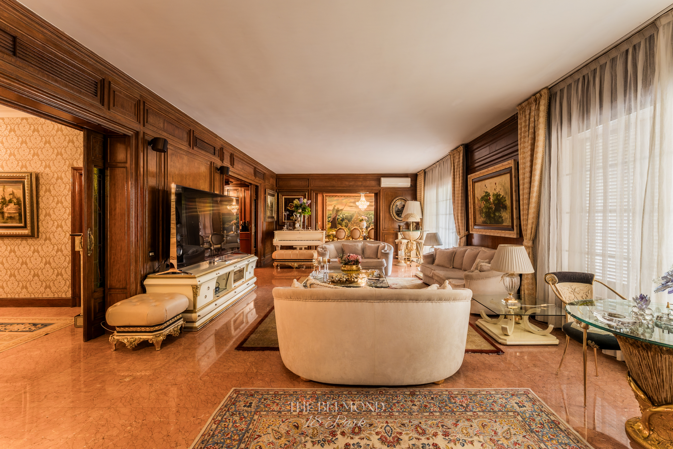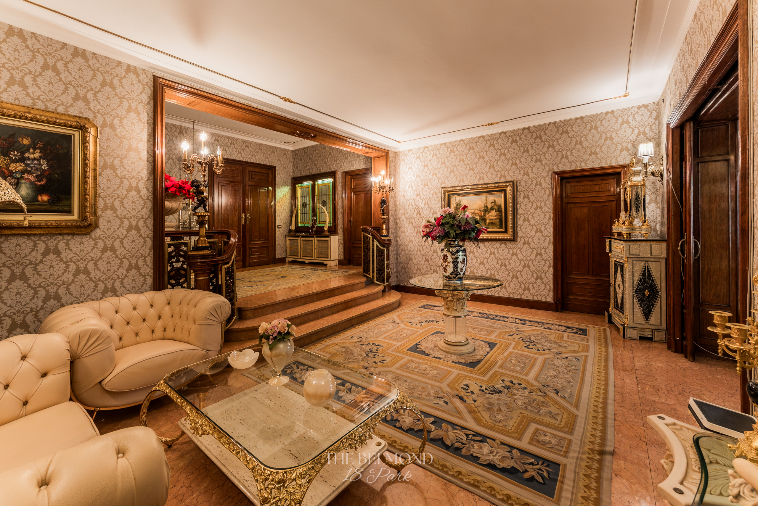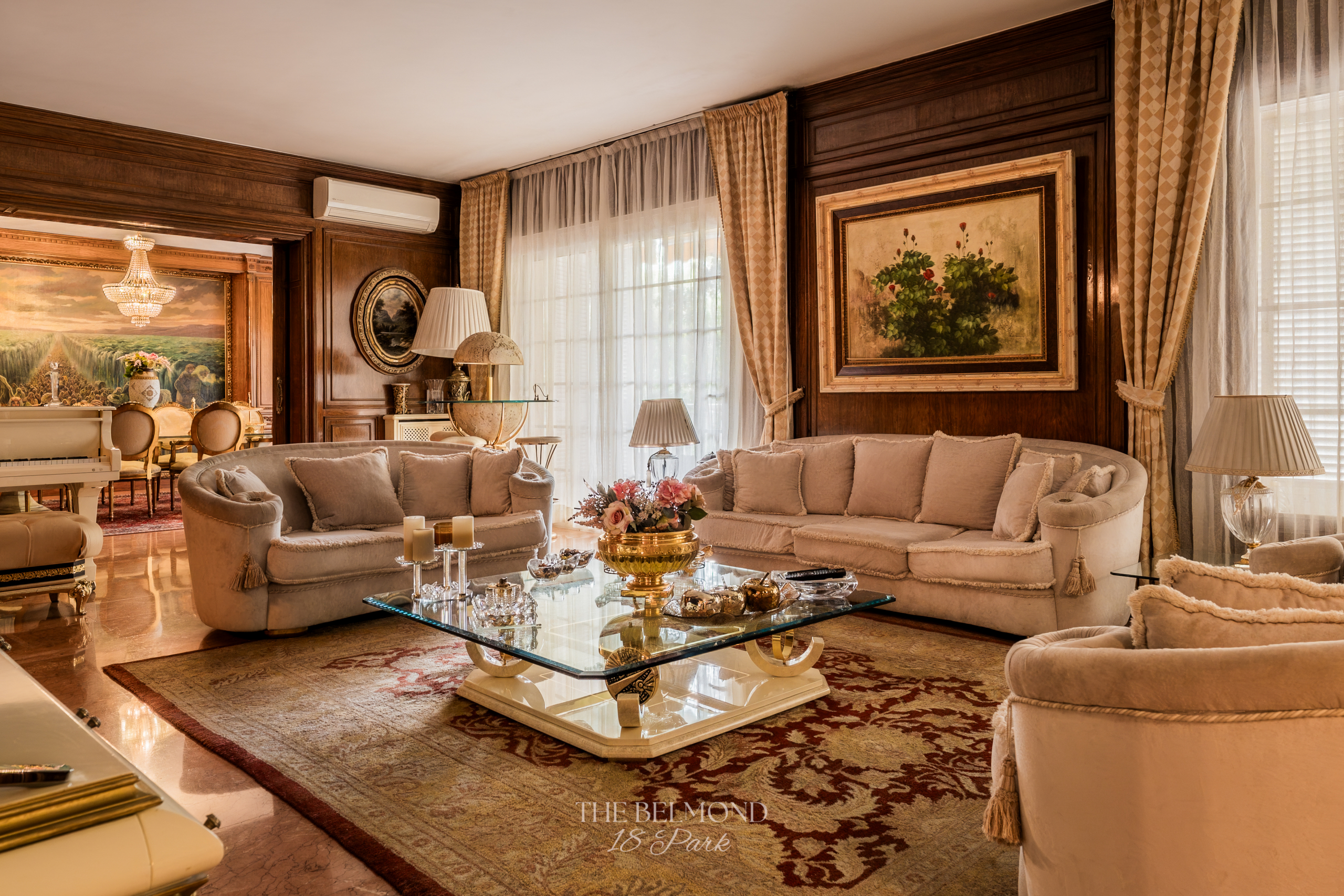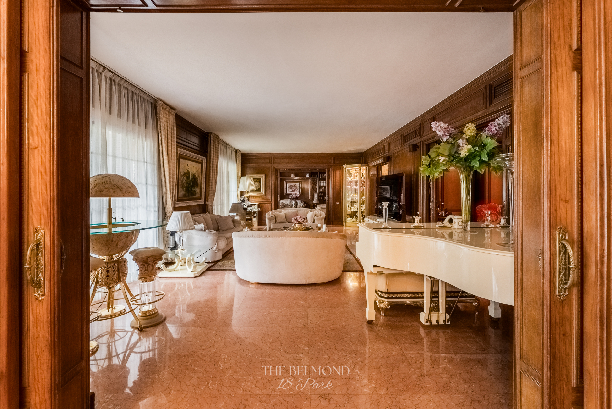 El acceso a la propiedad se realiza a través de un elegante hall que conduce a una majestuosa zona de día, compuesta por un gran salón, comedor y una refinada biblioteca, todos ellos con salida directa a la terraza y con una continuidad visual única hacia el Turó Park, creando una sensación de espacio y luminosidad excepcionales.