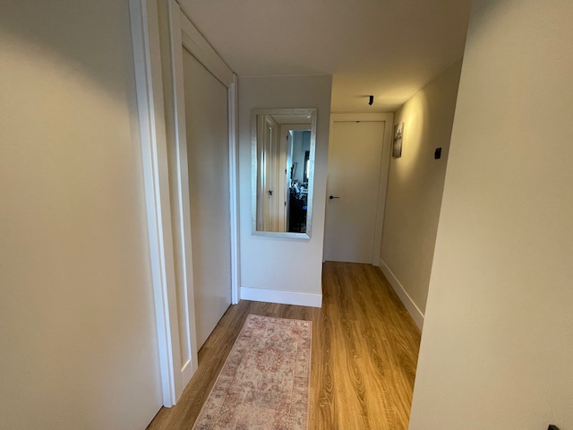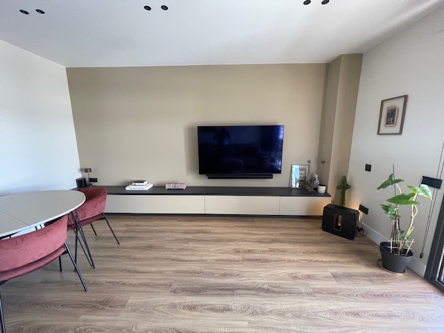 • Suelo de parquet nuevo en una sola pieza, sin pasos de puerta, con zócalo alto moderno.